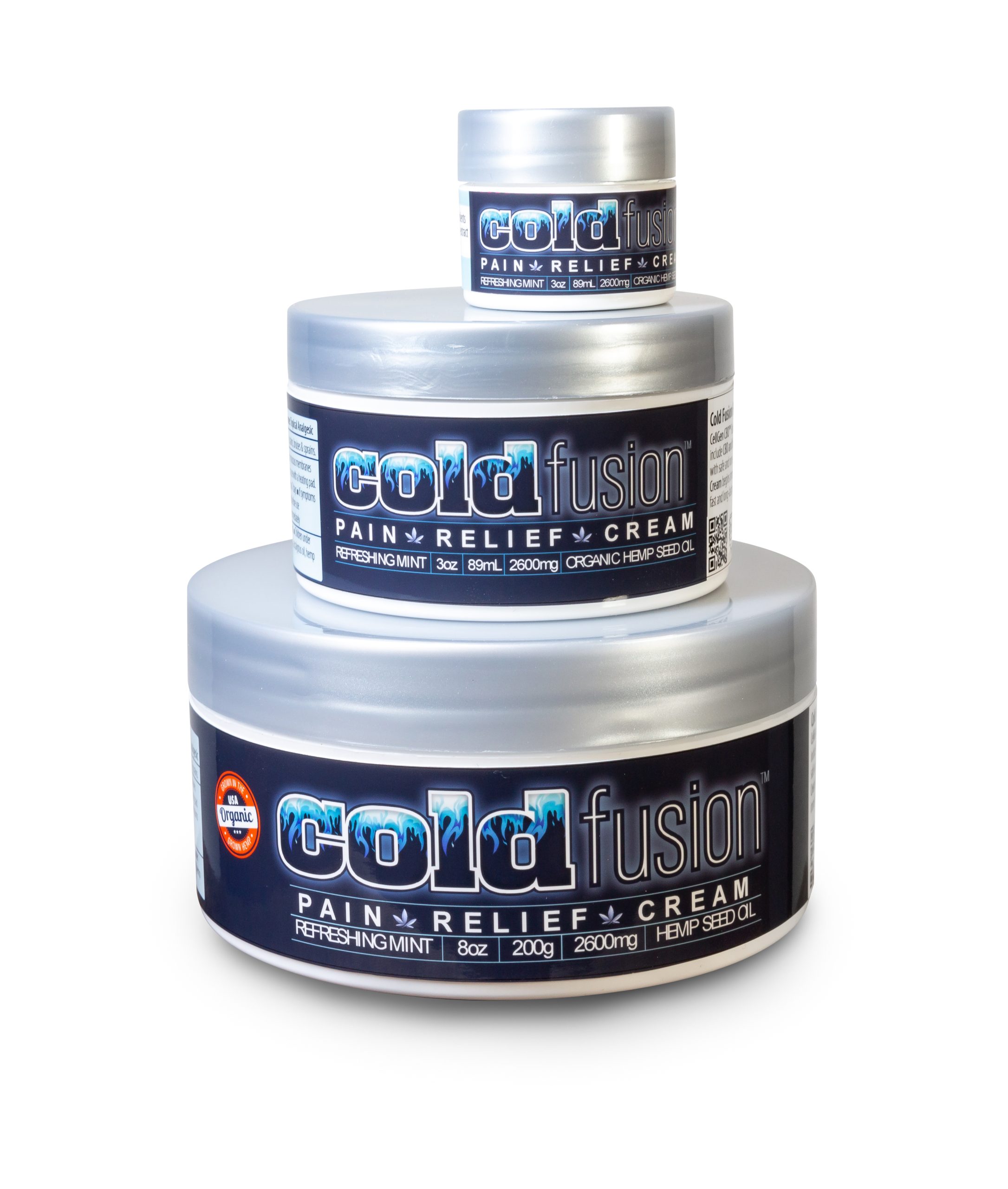 ColdFusion™ pain relief sports products contain our proprietary blend of ingredients including high concentrations of organic hemp seed oil. Our products are made with with FDA-approved active ingredients plus safe and non-psychoactive (0.00%THC), (0.00% CBD), (0.00% cannabinoids) organic legal hemp seed oil. Our fast-acting Hemp Sports Cream starts working as soon as applied to relax muscles and treat everyday discomfort.